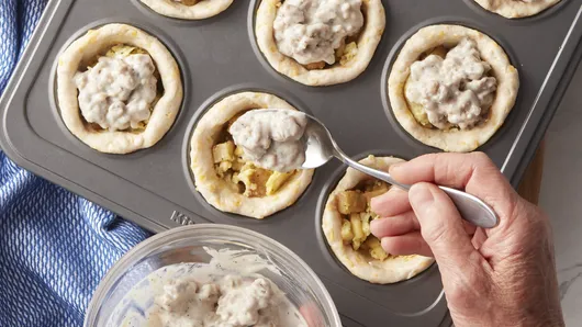 Once the biscuits are pressed into the muffin cups, the sausage-gravy mixture and scrambled eggs with potatoes are simply spooned into the cups before baking!