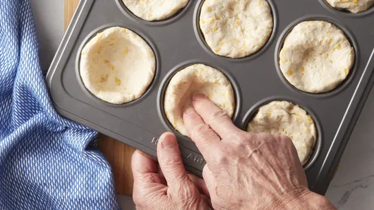 For the quickest and easiest way to line the cup, we center a round of biscuit dough over a muffin cup, pressing it over the bottom first and then pressing the remaining dough to the side. Press and push the dough with your fingers (if necessary) to cover the entire surface of the muffin cup as well as 1/2 inch above the cup to make a rim.