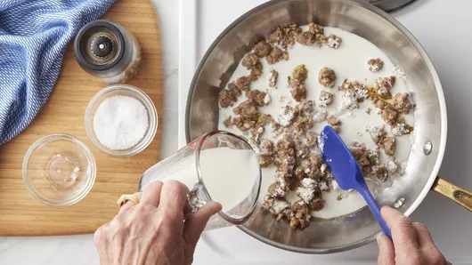 Bulk pork sausage is cooked and then made into a simple sausage gravy just by adding flour, milk and seasonings. Feel free to use regular pork sausage sweet (mild) Italian or spicy (hot) Italian bulk Italian sausage. Since bulk sausage comes in 16-ounce packages, you can always go ahead and cook up the entire pound to get a jump on other upcoming meals! Spoon it into a heatproof bowl to cool it down before moving it to resealable food-storage plastic freezer bags. Store any extra meat you don't plan to use for your breakfast in the freezer for up to 3 months.
