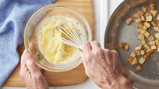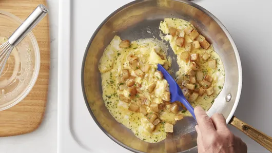 The potatoes are cooked before adding a seasoned scrambled egg mixture, where they can all cook together as the second component of these sausage and egg cups.