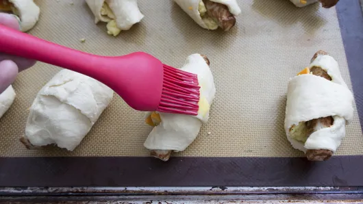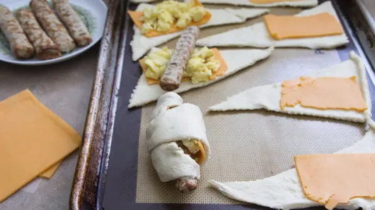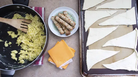 Step2Unroll dough onto work surface; separate into 8 triangles. Cut cheese slices in half; place 1 half on each triangle. Top each with spoonful of scrambled eggs and 1 sausage link. Loosely roll up triangles as directed on can; place on ungreased cookie sheet.