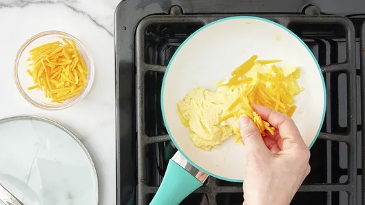 Step2Meanwhile, in small bowl, beat eggs thoroughly with fork or whisk until well mixed. In 8-inch nonstick skillet, heat butter over medium heat just until butter begins to sizzle. Add beaten eggs; quickly begin stirring constantly. As eggs begin to thicken, stop stirring and cook an additional 30 to 60 seconds or until eggs are set. Fold eggs in half; turn off heat. Top eggs with shredded cheese; cover and let stand about 2 minutes or until cheese melts. Cut eggs in half.