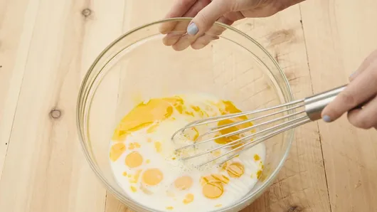 Step1In medium bowl, combine eggs, milk and salt. Beat slightly with fork or wire whisk until well blended.