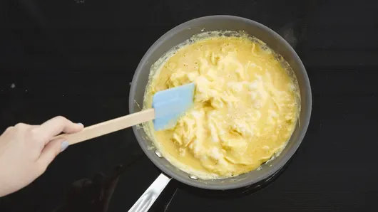 Step2Melt margarine in medium skillet over medium heat; tilt pan to coat. Add egg mixture. Reduce heat to low. Cook until firm but still moist, stirring frequently.