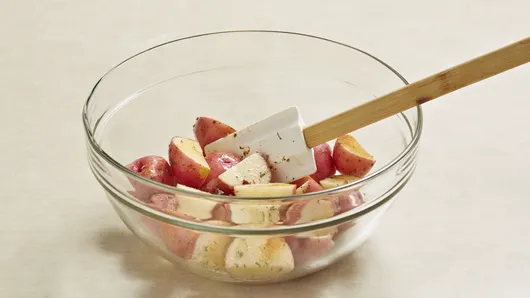 Step2In medium microwavable bowl, toss potatoes, 1/2 teaspoon of the seasoned salt, 1/2 teaspoon of the Italian seasoning and the oil to coat. Microwave on High 4 minutes or just until potatoes are fork-tender.