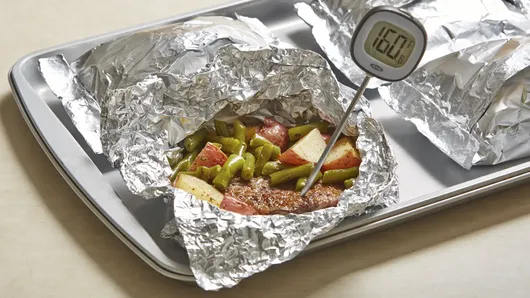 Step4When grill is heated, place packets on gas grill over medium heat or on charcoal grill over medium coals; cover grill. Cook 30 to 40 minutes, turning packets over once halfway through cooking, until meat thermometer inserted in center of patties reads 160°F and potatoes are tender. Carefully open packets to allow steam to escape.