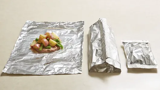 Step1Heat gas or charcoal grill. Cut four 18x12-inch sheets of Reynolds Wrap® Heavy Duty Foil; spray foil with cooking spray.