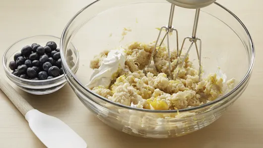 In large bowl, break up cookie dough. Add sour cream, egg and lemon zest. (DO NOT EAT RAW COOKIE DOUGH AFTER COMBINING WITH EGG.) Beat with electric mixer on medium-low speed 2 to 3 minutes or until smooth. Fold in blueberries. Spoon mixture evenly into pan.