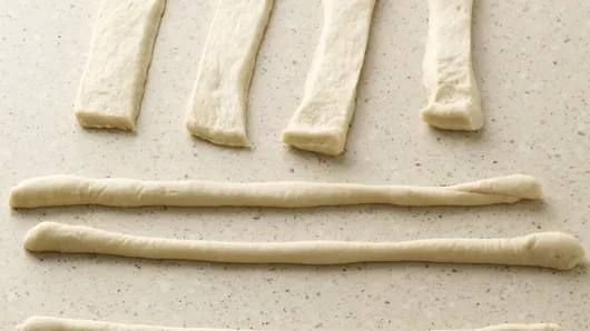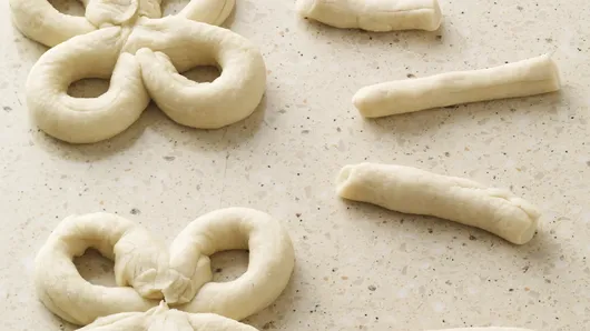 Step2Unroll dough on work surface; separate into 12 breadsticks. Roll and stretch each breadstick into 12-inch rope. Reserve 2 ropes for making shamrock stems. Pinch ends of 1 remaining rope together in center of rope to form 2 circles; repeat with remaining 9 ropes. Pinch 2 formed ropes together to make shamrock shape. Repeat to make total of 5 shamrocks.