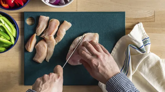 Using a sharp knife, slice the chicken breast lengthwise into1/2-inch” wide strips.