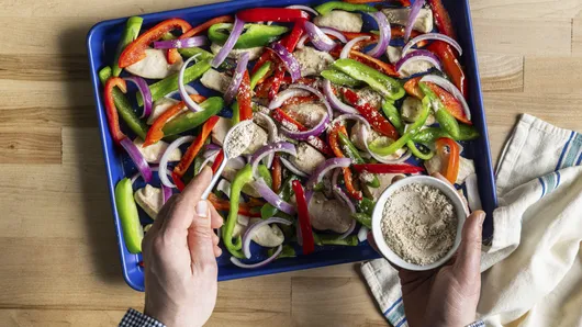 Remove the pan from the oven and arrange the sliced peppers and onions around the chicken. Drizzle the vegetables with the oil, and season with the fajitas seasoning.