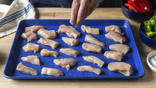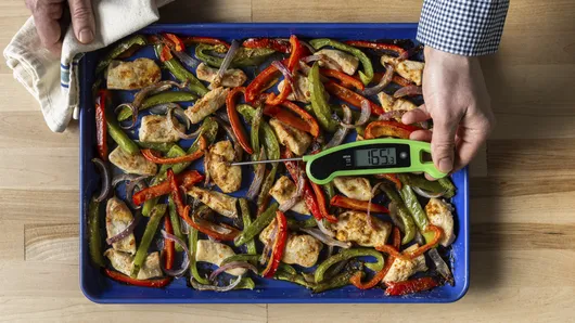 var configuration = {"title":"Sheet-Pan Chicken Fajitas","introduction":"\u003cp\u003eThese sheet-pan fajitas are a quick and easy twist on the classic Tex-Mex dish, made entirely in the oven—no grill required.\u003c/p\u003e\u003cp\u003eJuicy, seasoned strips of chicken roast alongside colorful bell peppers and onions, creating bold, smoky flavors with tender, slightly caramelized textures. Served hot with warm tortillas and your favorite Tex-Mex toppings, they’re perfect for busy weeknights when you need a flavorful one-pan meal without the fuss.\u003c/p\u003e\u003cp\u003eThis recipe comes together in less than an hour, and makes enough for yummy leftovers the next day!\u003c/p\u003e","servingSize":"1 Serving","image":{"small":{"media":"(min-width: 0px)","src":"https://mojo.generalmills.com/api/public/content/Ul_VZqGtS_SSSuwDCu6USg_webp_base.webp?v=1fdddd96\u0026t=e724eca7b3c24a8aaa6e089ed9e611fd"},"medium":{"media":"(min-width: 500px)","src":"https://mojo.generalmills.com/api/public/content/Ul_VZqGtS_SSSuwDCu6USg_webp_base.webp?v=1fdddd96\u0026t=191ddcab8d1c415fa10fa00a14351227"},"large":{"media":"(min-width: 767px)","src":"https://mojo.generalmills.com/api/public/content/Ul_VZqGtS_SSSuwDCu6USg_webp_base.webp?v=1fdddd96\u0026t=191ddcab8d1c415fa10fa00a14351227"},"alt":"Sheet-Pan Chicken Fajitas"},"contributor":{"label":"By","name":"Created by Nick","profileUrl":"/about-us/nick","displayDate":{"label":"Updated","date":"Jun 12, 2025"}},"ingredientGroups":[{"ingredients":[{"quantity":"4","description":"boneless skinless chicken breasts"},{"quantity":"2","description":"teaspoons kosher (course) salt"},{"quantity":"2","description":"red bell peppers"},{"quantity":"2","description":"green bell peppers"},{"quantity":"1","description":"large red onion"},{"quantity":"1","description":"tablespoon vegetable oil"},{"quantity":"1","description":"packet (1 oz) Old El Paso™ Fajitas Seasoning Mix"},{"quantity":"1","description":"package (8.2 oz) Old El Paso™ Flour Tortillas for Soft Tacos and Fajitas (10 Count), for serving"},{"quantity":"1","description":"container (7 oz) Old El Paso™ Crema Mexicana, for serving"},{"quantity":"","description":"Fresh cilantro, for serving"},{"quantity":"","description":"Lime wedges, for serving"}]}],"steps":[{"description":"\u003cp\u003eHeat the oven to 400°F and place an oven rack in the center of the oven.\u003c/p\u003e"},{"description":"\u003cp\u003eCut off the tops and bottoms of the bell peppers, and cut away the sides from the seeds in the center. Discard the seeds and pith. Slice the peppers into 1/2-inch” wide strips. Peel the onion and cut in half. Slice the onion crosswise into 1/2-inch” wide strips. Set aside.\u003c/p\u003e","stepShotImageUrl":"//mojo.generalmills.com/api/public/content/qcpPkKzJRTWd7xVlFaHB0w_webp_base.webp?v=f39d2e0d\u0026t=51a43a57af4046789e5a7f20567b1195"},{"description":"\u003cp\u003eUsing a sharp knife, slice the chicken breast lengthwise into1/2-inch” wide strips.\u003c/p\u003e","stepShotImageUrl":"//mojo.generalmills.com/api/public/content/H5rjFhQWRui02_pcT9WfFA_webp_base.webp?v=a3a2e4f2\u0026t=51a43a57af4046789e5a7f20567b1195"},{"description":"\u003cp\u003ePlace the sliced chicken breasts on a sheet pan and season with the salt. Bake on the center rack for 15 minutes until the chicken is just starting to brown.\u003c/p\u003e","stepShotImageUrl":"//mojo.generalmills.com/api/public/content/q6pIRuEMTzOidXUhKU3uAg_webp_base.webp?v=2440acd5\u0026t=51a43a57af4046789e5a7f20567b1195"},{"description":"\u003cp\u003eRemove the pan from the oven and arrange the sliced peppers and onions around the chicken. Drizzle the vegetables with the oil, and season with the fajitas seasoning.\u003c/p\u003e","stepShotImageUrl":"//mojo.generalmills.com/api/public/content/KAJ6wFJdQlO7V35Kf5SoqQ_webp_base.webp?v=b621953d\u0026t=51a43a57af4046789e5a7f20567b1195"},{"description":"\u003cp\u003eReturn the pan to the oven and bake for another 20 to 22 minutes until the vegetables are tender and the chicken registers 165º F on an instant-read thermometer. Serve with Old El Paso Flour Tortillas, Old El Paso Crema Mexicana, cilantro, and lime wedges.\u003c/p\u003e","stepShotImageUrl":"//mojo.generalmills.com/api/public/content/tUUaQH5vQG-FizrNifZ5aw_webp_base.webp?v=96b5d838\u0026t=51a43a57af4046789e5a7f20567b1195"}],"tips":[{"title":"","description":"Easy sheet-pan fajitas with juicy chicken, roasted peppers, and bold Tex-Mex flavor—made in the oven for a quick, fuss-free weeknight meal!","category":"Rich Snippet","tipShots":[]},{"title":"TIP FROM THE Doughboy","description":"\u003cp\u003eLine your sheet pan with aluminum foil for easy cleanup!\u003c/p\u003e","category":"Pillsbury Highlight","tipShots":[]},{"title":"","description":"\u003cp\u003eShort on time? You can find pre-cut onions and peppers in the produce section of most grocery stores.\u003c/p\u003e","category":"Time Saving","tipShots":[]},{"title":"","description":"\u003cp\u003eIf you don’t want to cut raw chicken, you can pick up a pack of raw chicken tenders instead. These fajita-sized chicken cuts can be found in the fresh meat aisle of most grocery stores.\u003c/p\u003e","category":"Time Saving","tipShots":[]},{"title":"","description":"\u003cp\u003eLeftover fajita meat and veggies make the perfect filling for \u003ca href=\u0022https://www.pillsbury.com/recipes/chicken-and-corn-quesadillas/c4d4f511-ab6a-4bbc-b176-3dc57b2e5912\u0022\u003equesadillas\u003c/a\u003e—a perfect quick, family-friendly weeknight meal!\u003c/p\u003e","category":"Serving Suggestions/Menu","tipShots":[]}],"kitchenTips":[{"title":"","description":"\u003cp\u003eShort on time? You can find pre-cut onions and peppers in the produce section of most grocery stores.\u003c/p\u003e","category":"Time Saving","tipShots":[]},{"title":"","description":"\u003cp\u003eIf you don’t want to cut raw chicken, you can pick up a pack of raw chicken tenders instead. These fajita-sized chicken cuts can be found in the fresh mea