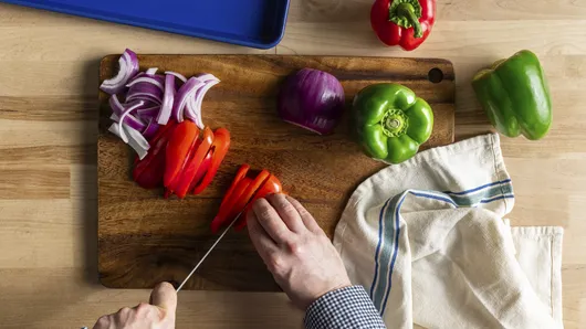 Cut off the tops and bottoms of the bell peppers, and cut away the sides from the seeds in the center. Discard the seeds and pith. Slice the peppers into 1/2-inch” wide strips. Peel the onion and cut in half. Slice the onion crosswise into 1/2-inch” wide strips. Set aside.