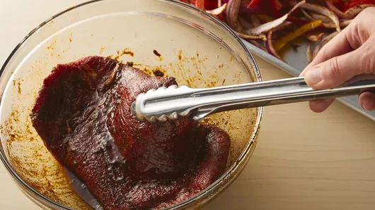var configuration = {"title":"Sheet Pan Fajitas","introduction":"\u003cp\u003eSteak fajitas may have gotten their Spanish nickname back in the 1930s from the ranch lands of Texas and Mexico. During cattle roundups, cows were frequently butchered to feed the ranch hands. Cuts of beef that were usually discarded, included meat trimmings such as skirt steak, were given to the Mexican vaqueros (cowboys) as part of their pay.\u003c/p\u003e\u003cp\u003eSkirt steak is one of the most flavorful cuts of beef, but it’s also one of the toughest. It comes from the diaphragm muscle; it’s long, thin, and like a belt. The word “fajita” comes from the Spanish word meaning “belt” or “sash.” When properly sliced and cooked the flavorful strips of this steak are absolutely delicious.\u003c/p\u003e\u003cp\u003eFajitas started gaining in popularity after being served on sizzling platters to tables in Texas restaurants. As the popularity of the dish grew, the less likely it was made with skirt steak, as there are a limited number of skirt steaks per cow. Other cuts of meat and other ingredients such as chicken, shrimp, or even vegetables started to be used to make “fajitas,” even though the name of the dish isn’t really applicable if skirt steak isn’t used.\u003c/p\u003e\u003cp\u003eOur fajita recipe slashes time out of the recipe. There is no standing over a hot stove or cooking in a cast-iron pan or grill. We broil both the meat and the veggies at the same time in the oven, so this quick version doesn’t have to be brought out only for special occasions. It’s fast enough for any weeknight meal! You can enjoy fajitas practically year around, as the dish is light enough for spring evenings yet hearty enough for a fall or winter supper. Give it a try and let us know how you like it.\u003c/p\u003e","servingSize":"1 Serving","image":{"small":{"media":"(min-width: 0px)","src":"https://mojo.generalmills.com/api/public/content/kVmhign59EuJxkZPq04XbQ_webp_base.webp?v=23d8bec3\u0026t=e724eca7b3c24a8aaa6e089ed9e611fd"},"medium":{"media":"(min-width: 500px)","src":"https://mojo.generalmills.com/api/public/content/kVmhign59EuJxkZPq04XbQ_webp_base.webp?v=23d8bec3\u0026t=191ddcab8d1c415fa10fa00a14351227"},"large":{"media":"(min-width: 767px)","src":"https://mojo.generalmills.com/api/public/content/kVmhign59EuJxkZPq04XbQ_webp_base.webp?v=23d8bec3\u0026t=191ddcab8d1c415fa10fa00a14351227"},"alt":"Sheet Pan Fajitas"},"contributor":{"label":"By","name":"Pillsbury Kitchens","profileUrl":"/about-us","displayDate":{"label":"Updated","date":"Jan 1, 2025"}},"ingredientGroups":[{"ingredients":[{"quantity":"2","description":"tablespoons chili powder"},{"quantity":"2","description":"teaspoons ground cumin"},{"quantity":"2","description":"teaspoons salt"},{"quantity":"1/2","description":"teaspoon garlic powder"},{"quantity":"1","description":"medium red onion, halved and cut into 1/4-inch slices"},{"quantity":"2","description":"medium red or yellow bell peppers, cut into 1/4-inch strips"},{"quantity":"1/4","description":"cup vegetable oil"},{"quantity":"1 1/3","description":"lb beef flank steak"},{"quantity":"6","description":"tortillas from 1 package (8.2 oz) Old El Paso™ Flour Tortillas for Soft Tacos and Fajitas (10 Count)"}]},{"name":"Make it FRESH toppings, as desired","ingredients":[{"quantity":"","description":"Lime wedges"},{"quantity":"","description":"Sour cream"},{"quantity":"","description":"Salsa"},{"quantity":"","description":"Guacamole"},{"quantity":"","description":"Chopped fresh cilantro"}]}],"steps":[{"description":"Position oven rack 4 inches from broiler. Spray 18x13x1-inch pan with cooking spray. In small bowl, mix chili powder, cumin, salt and garlic powder.","stepShotImageUrl":"//mojo.generalmills.com/api/public/content/QRpcsAukek-h-k8_U3vXsA_webp_base.webp?v=8fe99a7c\u0026t=51a43a57af4046789e5a7f20567b1195"},{"description":"In large bowl, toss onion, bell peppers, 2 tablespoons of the vegetable oil and 1 tablespoon of the seasoning mixture; mix until evenly coated. Transfer vegetable mixture to pan in single layer, allowing room for steak. In same bowl, add remaining 2 tablespoons oil and remaining seasoning mixture. Add steak; rub mixture into steak. Transfer steak to pan with vegetables.","stepShotImageUrl":"//mojo.generalmills.com/api/public/content/1QkaFZN0IUGiTNbNaQSdvA_webp_base.webp?v=2b5193a8\u0026t=51a43a57af4046789e5a7f20567b1195"},{"description":"Broil 9 to 11 minutes, stirring vegetables once, until instant-read thermometer inserted in thickest part of steak reads 145°F to 160°F (medium-rare to medium). Transfer steak to cutting board; cover with foil. Let stand 5 minutes. Stir vegetables, and return to oven 2 to 6 minutes or until vegetables are blackened in spots."},{"description":"Thinly slice steak on the bias, against the grain. Serve with vegetables in tortillas with remaining ingredients.","stepShotImageUrl":"//mojo.generalmills.com/api/public/content/hL69sES0FUWMqiC788iesQ_webp_base.webp?v=95d93013\u0026t=51a43a57af4046789e5a7f20567b1195"}],"tips":[{"title":"","description":"This easy fajitas recipe broils seasoned flank steak, roasted peppers, and onions all on one sheet pan, for a delicious and flavorful no-fuss dinner.","category":"Rich Snippet","tipShots":[]},{"title":"","description":"Feel free to use your favorite bell pepper, and add color by choosing a variety like yellow, red and orange.","category":"Recipe/Ingredient Facts","tipShots":[]},{"title":"","description":"You may notice some watering out on sheet pan after baking, which is normal. Simply pour off the liquid before serving.","category":"Serving Suggestions/Menu","tipShots":[]},{"title":"","description":"Kitchen Tested - 5/2017.","category":"Kitchen Tested","tipShots":[]}],"kitchenTips":[{"title":"","description":"Feel free to use your favorite bell pepper, and add color by choosing a variety like yellow, red and orange.","category":"Recipe/Ingredient Facts","tipShots":[]},{"title":"","descript