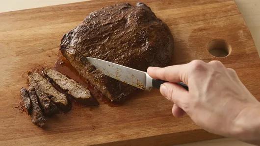 For tender slices, this cut of steak needs to be cut in a certain way. The long ridges that run through the steak is known as the “grain.” To cut across the grain, rotate the steak if necessary so the grain is running parallel to the edge of your work surface. This way, when you make cuts, it will be against the grain, which is desirable to cut through the fibrous texture of this steak. Holding the knife at a 45-degree angle, cut the steak into thin slices. Serve the slices of steak with the veggies and tortillas.