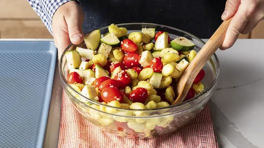 Combine your gnocchi, tomatoes, zucchini, garlic, olive oil, butter, and crushed red pepper flakes, salt, and black pepper in a large bowl. Toss until everything is evenly coated.