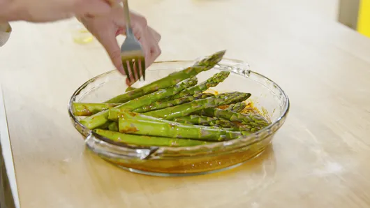 While potatoes are cooking, prepare the asparagus. Place asparagus in the same shallow dish, and drizzle with 1 tablespoon olive oil. Toss to coat.