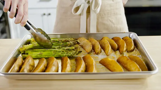 When potatoes have cooked 15 minutes, remove from the oven and flip each wedge over, making room for the asparagus. Add asparagus to the pan and place back into the oven. Roast for 10 minutes.