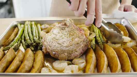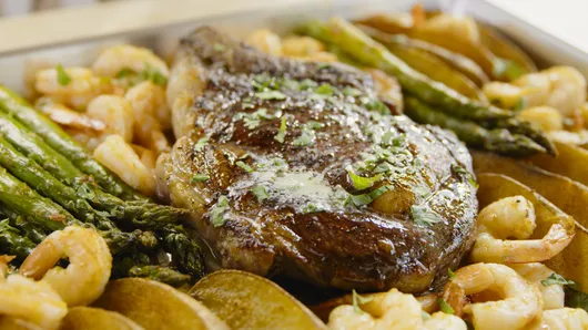 var configuration = {"title":"Sheet-Pan Surf and Turf","introduction":"\u003cp\u003eA fancy steakhouse surf and turf dinner won’t break the bank if you make it at home! This onesheet-pan meal has it all—a big juicy steak, perfectly plump shrimp, seasoned potato wedges, and snappy asparagus. With so many components, each diner gets a sample of everything; just add crescents and you’ll have a complete spread fit for a king. So you don’t leave a bit of flavor behind, try drizzling the pan juices over your steak and shrimp before digging in. Serve this at your next intimate dinner party, and you’ll even have time to enjoy a beverage with your guests before the meal.\u003c/p\u003e","servingSize":"1 Serving","image":{"small":{"media":"(min-width: 0px)","src":"https://mojo.generalmills.com/api/public/content/4UhW3DS5Ry2sSB5goaepBw_webp_base.webp?v=5fd15211\u0026t=e724eca7b3c24a8aaa6e089ed9e611fd"},"medium":{"media":"(min-width: 500px)","src":"https://mojo.generalmills.com/api/public/content/4UhW3DS5Ry2sSB5goaepBw_webp_base.webp?v=5fd15211\u0026t=191ddcab8d1c415fa10fa00a14351227"},"large":{"media":"(min-width: 767px)","src":"https://mojo.generalmills.com/api/public/content/4UhW3DS5Ry2sSB5goaepBw_webp_base.webp?v=5fd15211\u0026t=191ddcab8d1c415fa10fa00a14351227"},"alt":"Sheet-Pan Surf and Turf"},"contributor":{"label":"By","name":"Edited by Mandy","profileUrl":"/about-us/mandy","displayDate":{"label":"Updated","date":"Sep 9, 2025"}},"ingredientGroups":[{"name":"Potatoes","ingredients":[{"quantity":"2","description":"medium (about 8 oz each) russet potatoes, scrubbed, each sliced lengthwise into 8 equal wedges"},{"quantity":"3","description":"tablespoons olive oil"},{"quantity":"1","description":"teaspoon garlic powder"},{"quantity":"1","description":"teaspoon paprika"},{"quantity":"1","description":"teaspoon kosher salt"},{"quantity":"1/2","description":"teaspoon onion powder"}]},{"name":"Asparagus","ingredients":[{"quantity":"1","description":"lb asparagus, trimmed"},{"quantity":"1","description":"tablespoon olive oil"}]},{"name":"Shrimp","ingredients":[{"quantity":"1","description":"lb raw, peeled and deveined large shrimp (16 to 20 count), with tails on"},{"quantity":"2","description":"tablespoons olive oil"},{"quantity":"1","description":"tablespoon fresh lemon juice, plus more for squeezing over cooked shrimp"},{"quantity":"1/2","description":"teaspoon kosher salt"},{"quantity":"1/2","description":"teaspoon garlic powder"}]},{"name":"Steak","ingredients":[{"quantity":"1","description":"beef T-bone steak, about 1 lb, at least 1-inch thick"},{"quantity":"1/2","description":"teaspoon kosher salt"},{"quantity":"1/8","description":"teaspoon pepper"},{"quantity":"1/8","description":"teaspoon garlic powder"},{"quantity":"","description":"Butter, if desired"},{"quantity":"","description":"Parsley, if desired"}]}],"steps":[{"description":"\u003cp\u003ePosition top oven rack about 4 inches from broiler element and heat oven to 425°F. Spray an 18x13-inch rimmed sheet pan with cooking spray. Remove steak from the refrigerator, and let sit at room temperature while preparing the potatoes, asparagus, and shrimp.\u003c/p\u003e"},{"description":"\u003cp\u003eIn a shallow dish, mix together 3 tablespoons olive oil, 1 teaspoon garlic powder, paprika, 1 teaspoon salt, and onion powder. Roll each potato wedge in the olive oil mixture, and place on the pan so they lay flat on one side. Place sheet pan on the top rack of oven and roast for 15 minutes.\u003c/p\u003e","stepShotImageUrl":"//mojo.generalmills.com/api/public/content/i0-julaGTuKSrRYN3P3vKg_webp_base.webp?v=16b6bb9c\u0026t=51a43a57af4046789e5a7f20567b1195"},{"description":"\u003cp\u003eWhile potatoes are cooking, prepare the asparagus. Place asparagus in the same shallow dish, and drizzle with 1 tablespoon olive oil. Toss to coat.\u003c/p\u003e","stepShotImageUrl":"//mojo.generalmills.com/api/public/content/HfyI3tt-TLGqzYBTcKDyfw_webp_base.webp?v=113f0b51\u0026t=51a43a57af4046789e5a7f20567b1195"},{"description":"\u003cp\u003eWhen potatoes have cooked 15 minutes, remove from the oven and flip each wedge over, making room for the asparagus. Add asparagus to the pan and place back into the oven. Roast for 10 minutes.\u003c/p\u003e","stepShotImageUrl":"//mojo.generalmills.com/api/public/content/a39SzBzuS1WxB50kVOqTSg_webp_base.webp?v=613a42d7\u0026t=51a43a57af4046789e5a7f20567b1195"},{"description":"\u003cp\u003eWhile the asparagus and potatoes cook, prepare the shrimp. Add 2 tablespoons olive oil, lemon juice, 1/2 teaspoon salt, and 1/2 teaspoon garlic powder to the same shallow dish; stir to combine. Add shrimp and toss to coat.\u003c/p\u003e","stepShotImageUrl":"//mojo.generalmills.com/api/public/content/eea8Jk7eQceaAvkTg4JuEg_webp_base.webp?v=5edccb7d\u0026t=51a43a57af4046789e5a7f20567b1195"},{"description":"\u003cp\u003eAfter the potatoes and asparagus have cooked for 10 minutes, remove pan from the oven and adjust oven control to broil setting. Make space on the pan for the steak. When oven is ready, season steak on both sides with 1/2 teaspoon salt, pepper, and 1/8 teaspoon garlic powder. Place on pan and broil for 5 to 6 minutes, depending on how you like your steak.\u003c/p\u003e","stepShotImageUrl":"//mojo.generalmills.com/api/public/content/8brWrgPiRLCOWzPq71b5YQ_webp_base.webp?v=abaf6ef9\u0026t=51a43a57af4046789e5a7f20567b1195"},{"description":"\u003cp\u003eRemove pan from the oven, turn steak over, and add shrimp to the pan. Arrange the shrimp flat around the steak as best as possible. Broil for 4 minutes, until shrimp are firm and opaque and both the shrimp and steak are at least 145°F in the center (use a food thermometer).\u003c/p\u003e","stepShotImageUrl":"//mojo.generalmills.com/api/public/content/ejZnsnw3Tsyp1K1JtqZ6qA_webp_base.webp?v=a905dd4e\u0026t=51a43a57af4046789e5a7f20567b1195"},{"description":"\u003cp\u003eServe with a squeeze of lemon on the shrimp, butter on the steak, and/or fresh parsley sprinkled on top if desired