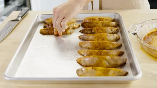 In a shallow dish, mix together 3 tablespoons olive oil, 1 teaspoon garlic powder, paprika, 1 teaspoon salt, and onion powder. Roll each potato wedge in the olive oil mixture, and place on the pan so they lay flat on one side. Place sheet pan on the top rack of oven and roast for 15 minutes.