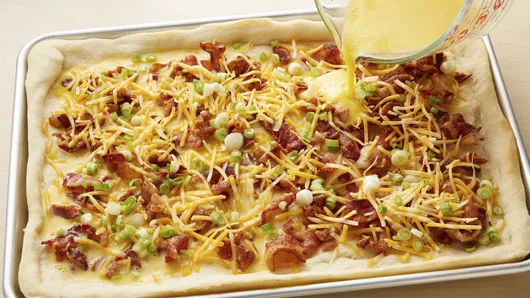 Step3Sprinkle bacon over baked crust. Top with 1 cup of the cheese and the green onions. Beat eggs in 4-cup glass measuring cup, and carefully pour eggs over cheese and green onions.