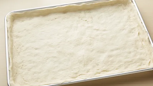 Step2Spray bottom of same 15x10x1-inch pan with cooking spray. Unroll pizza crust in pan; let stand 5 minutes. Press dough in bottom and firmly up sides of pan. Bake 10 minutes. If necessary, press down on prebaked crust if it puffs up during baking.