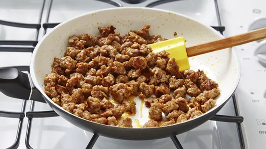Step2Meanwhile, in 10-inch skillet, cook sausage over medium-high heat 5 to 8 minutes, stirring occasionally, until no longer pink; drain.