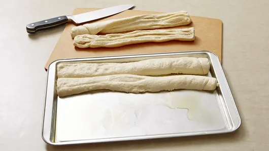 Step3Brush 2 tablespoons of the olive oil over bottom and sides of 15x10x1-inch pan. Remove dough from cans; cut each dough piece in half lengthwise down center to make a total of 4 pieces. Place dough pieces lengthwise in pan; press in bottom of pan to form crust; set aside.