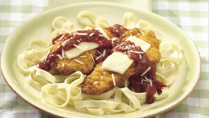 Add something hearty to your family's Italian cuisine night! Serve chicken parmigiana with sauce – a dish that’s ready in 30 minutes.