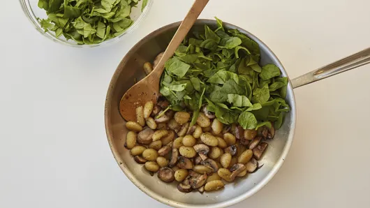 Step4Stir in mushrooms, 1 tablespoon thyme, the salt, pepper and half of the reserved brown butter. Cook 3 to 4 minutes, stirring frequently, until mushrooms are tender. Stir in remaining half brown butter and the garlic; cook and stir about 1 minute or until fragrant. Gradually add spinach to skillet; continue cooking just until wilted.