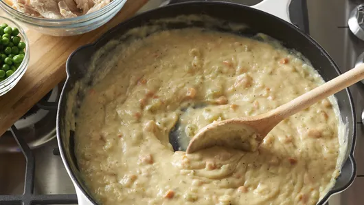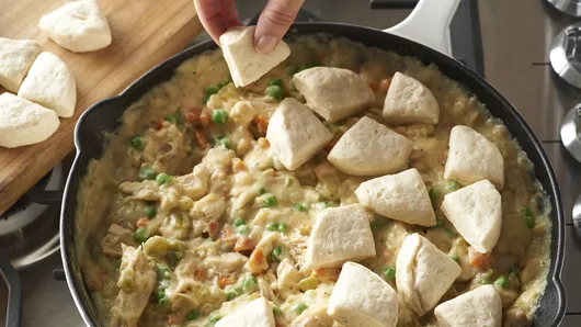 var configuration = {"title":"Skillet Chicken Biscuit Pot Pie","introduction":"\u003cp\u003eThis skillet chicken pot pie with biscuits is simple to make, all in one pan! It’s genius how creamy chicken and veggies in gravy are made in a skillet before Pillsbury™ Grands!™ Biscuits top it, and it finishes baking in the oven. Delish!\u003c/p\u003e","servingSize":"1 Serving","image":{"small":{"media":"(min-width: 0px)","src":"https://mojo.generalmills.com/api/public/content/z7H39DsLrUWIBk-LTwoVwQ_webp_base.webp?v=91ea94ad\u0026t=e724eca7b3c24a8aaa6e089ed9e611fd"},"medium":{"media":"(min-width: 500px)","src":"https://mojo.generalmills.com/api/public/content/z7H39DsLrUWIBk-LTwoVwQ_webp_base.webp?v=91ea94ad\u0026t=191ddcab8d1c415fa10fa00a14351227"},"large":{"media":"(min-width: 767px)","src":"https://mojo.generalmills.com/api/public/content/z7H39DsLrUWIBk-LTwoVwQ_webp_base.webp?v=91ea94ad\u0026t=191ddcab8d1c415fa10fa00a14351227"},"alt":"Skillet Chicken Biscuit Pot Pie"},"contributor":{"label":"By","name":"Pillsbury Kitchens","profileUrl":"/about-us","displayDate":{"label":"Updated","date":"Sep 19, 2025"}},"ingredientGroups":[{"ingredients":[{"quantity":"1/2","description":"cup salted butter"},{"quantity":"1","description":"cup chopped onions"},{"quantity":"1","description":"cup chopped carrots (about 2 medium)"},{"quantity":"1","description":"cup chopped celery (about 3 stalks)"},{"quantity":"1/2","description":"teaspoon salt"},{"quantity":"1/2","description":"teaspoon pepper"},{"quantity":"1/2","description":"cup all-purpose flour"},{"quantity":"2","description":"cups Progresso™ Classic Chicken Broth (from 32-oz carton)"},{"quantity":"1","description":"cup 2% milk "},{"quantity":"2","description":"cups shredded cooked chicken"},{"quantity":"1","description":"cup frozen sweet peas"},{"quantity":"1","description":"can (16.3 oz) refrigerated Pillsbury™ Grands!™ Southern Homestyle Buttermilk Biscuits (8 Count)","productLink":"/products/biscuits/grands-refrigerated-biscuits/homestyle-buttermilk"}]}],"steps":[{"description":"Heat oven to 375°F. In 12-inch ovenproof skillet, melt butter over medium-high heat. Add onions, carrots, celery, salt and pepper; cook 5 to 7 minutes, stirring frequently, until tender. Stir in flour; cook 1 to 3 minutes or until beginning to brown. Gradually stir in broth and milk, cooking and stirring 1 to 3 minutes longer, until bubbly and thickened. Stir in chicken and peas. Remove from heat.","stepShotImageUrl":"//mojo.generalmills.com/api/public/content/1gBKD1vJEUGSJALOjNn6Nw_webp_base.webp?v=24ef1b10\u0026t=51a43a57af4046789e5a7f20567b1195"},{"description":"\u003cp\u003eSeparate dough into 8 biscuits. Cut each biscuit into fourths. Top hot chicken mixture with biscuit pieces.\u003c/p\u003e","stepShotImageUrl":"//mojo.generalmills.com/api/public/content/08IBBUwHfkaC0pDH0S1OZw_webp_base.webp?v=0fb9bf3f\u0026t=51a43a57af4046789e5a7f20567b1195"},{"description":"Bake 21 to 25 minutes or until biscuits are golden brown. Let stand 5 minutes before serving."}],"tips":[{"title":"","description":"Our skillet chicken biscuit pot pie has a 5-star rating! Its creamy, rich chicken and veggie filling topped with fluffy biscuits bakes up into bubbly goodness ready in less than an hour.","category":"Rich Snippet","tipShots":[]},{"title":"","description":"A cast-iron skillet looks great and also helps the biscuits brown beautifully, but easy-to-clean stainless steel works just as well.","category":"Techniques","tipShots":[]},{"title":"","description":"This would be a great recipe to use with any leftover cooked turkey! Substitute cut-up cooked turkey for the cooked chicken.","category":"Substitution","tipShots":[]},{"title":"","description":"Add the biscuit pieces while the chicken-veggie mixture is hot, to ensure they get done on the bottoms. If the chicken-veggie mixture has cooled down, it won’t cook the biscuits properly and they will be doughy.","category":"Method Note","tipShots":[]},{"title":"","description":"We cut the biscuits into fourths to get them done faster…and they’re totally easy to eat with a fork or spoon!","category":"Method Note","tipShots":[]},{"title":"","description":"Pot pies are a great way to use up your leftover chicken and cooked veggies. We love this version with biscuits on top, as it’s a cinch to put together. With the variety of fillings and toppings you can use, you can change it up each time you make it! Try our \u003ca href=\u0022https://www.pillsbury.com/recipes/grands-mini-chicken-pot-pies/0e592952-6d19-403c-b156-882da7be33cf\u0022\u003emini chicken pot pies\u003c/a\u003e or any of these \u003ca href=\u0022https://www.pillsbury.com/everyday-eats/dinner-tonight/pot-pies/15-top-pot-pies\u0022\u003esurprising pot pies\u003c/a\u003e next time you want a twist.","category":"Editorial","tipShots":[]},{"title":"","description":"\u003cp\u003eKitchen Tested - 9/2025.\u003c/p\u003e","category":"Kitchen Tested","tipShots":[]}],"kitchenTips":[{"title":"","description":"A cast-iron skillet looks great and also helps the biscuits brown beautifully, but easy-to-clean stainless steel works just as well.","category":"Techniques","tipShots":[]},{"title":"","description":"This would be a great recipe to use with any leftover cooked turkey! Substitute cut-up cooked turkey for the cooked chicken.","category":"Substitution","tipShots":[]},{"title":"","description":"Add the biscuit pieces while the chicken-veggie mixture is hot, to ensure they get done on the bottoms. If the chicken-veggie mixture has cooled down, it won’t cook the biscuits properly and they will be doughy.","category":"Method Note","tipShots":[]},{"title":"","description":"We cut the biscuits into fourths to get them done faster…and they’re totally easy to eat with a fork or spoon!","category":"Method Note","tipShots":[]}],"additionalContent":[{"title":"What is Skillet Chicken Biscuit Pot Pie?","description":"This homemade skillet chicken pot pie with biscuits starts by cooking a 