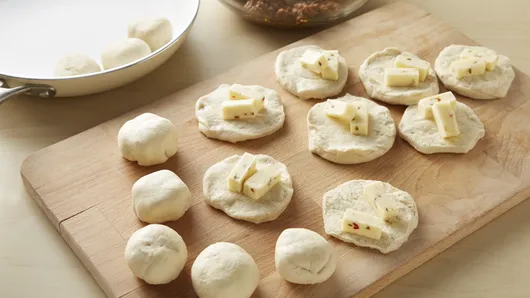 Step2Separate dough into 8 biscuits. Separate each biscuit into 2 rounds. Cut each cheese stick into 4 equal pieces. Place 2 pieces of cheese on center of each biscuit round. Fold edges up and over cheese; pinch firmly to seal; roll into a ball. Place around edge of skillet with pinched end facing down.