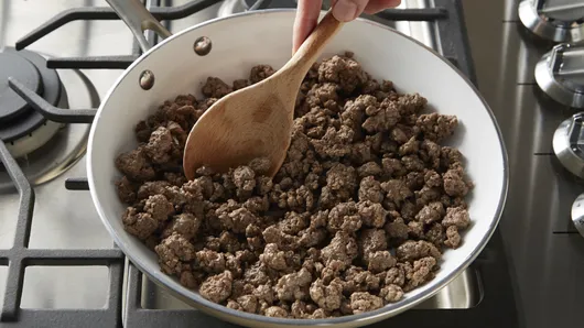 Step1Heat oven to 350°F. In 12-inch ovenproof skillet, cook beef over medium-high heat 5 to 7 minutes, stirring frequently, until brown; drain. In small bowl, place 1/2 teaspoon of the taco seasoning mix; set aside. Add remaining seasoning mix and water to skillet. Heat to boiling. Reduce heat; simmer uncovered 3 to 5 minutes, stirring frequently, until mixture has thickened and liquid has reduced. Pour into medium bowl. Carefully wipe out skillet. Spray with cooking spray.