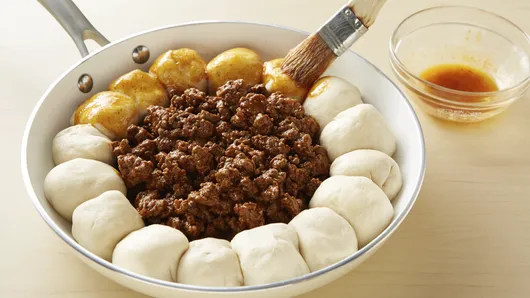 Step3Pour beef mixture into center of skillet. To small bowl with 1/2 teaspoon seasoning mix, add melted butter; blend. Brush biscuits with butter mixture. Bake 23 to 27 minutes or until biscuits are cooked through and deep golden brown on top.