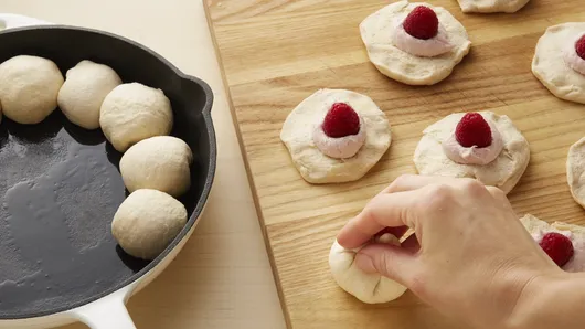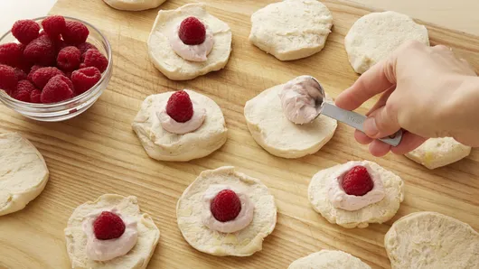 Step2Separate dough into 8 biscuits; split biscuits in half, making total of 16 biscuit rounds. Press each into 3-inch circle. Spoon about 1 tablespoon of the cream cheese mixture in center of each biscuit round, and top with 1 raspberry.