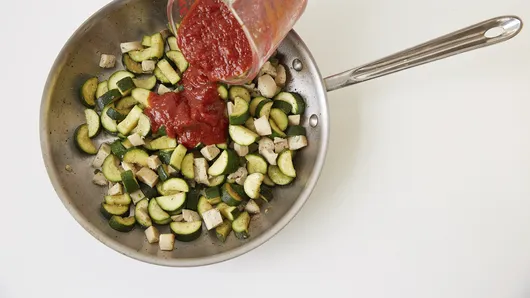 Step1In 12-inch nonstick skillet, heat oil over medium-high heat. Add zucchini, salt and pepper; cook 8 minutes, stirring frequently. Stir in chicken; reduce heat to medium. Continue cooking 3 to 5 minutes or until vegetables are crisp-tender. Stir in pasta sauce.