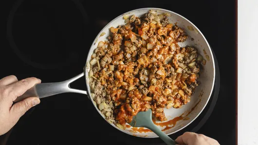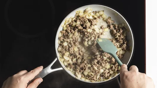 Heat oven to 350°F. Spray baking sheet and large skillet with nonstick cooking spray. In sprayed skillet, combine ground beef and onion; cook until beef is thoroughly cooked, stirring frequently. Drain.