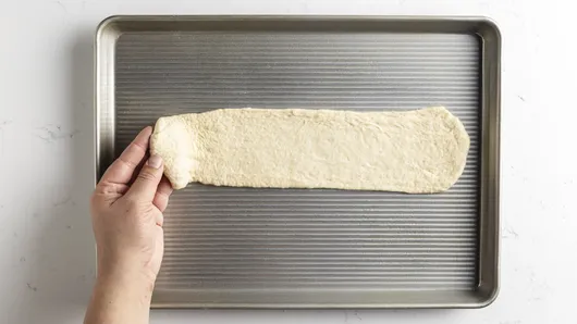 Meanwhile, remove dough from can; place on lightly floured surface. Cut loaf in half lengthwise. Roll each half to form 16x4-inch rectangle. Place 1 dough rectangle on sprayed baking sheet, being careful not to change shape.
