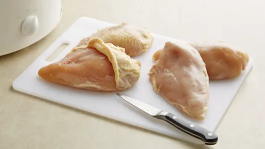 Step1Spray 3- to 4-quart slow cooker with cooking spray. Remove skin and any fat from chicken; place in cooker.