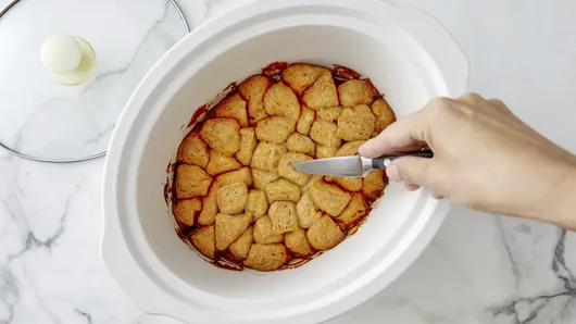 Cover top of insert with large kitchen towel. Place slow-cooker lid on top of towel. (This will prevent condensation from dripping onto biscuits during cooking.) Cook on High heat setting 1 1/2 to 2 1/2 hours. Insert knife into center of casserole to test if biscuits are fully baked; outer edge of casserole will be deep golden brown.