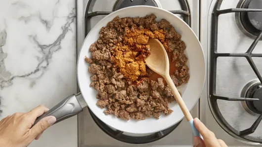 Spray 5- to 6-quart oval slow cooker with cooking spray. In 12-inch skillet, cook beef over medium-high heat 5 to 8 minutes, stirring frequently, until thoroughly cooked; drain. Stir in taco seasoning mix and water; heat to boiling. Reduce heat; simmer uncovered 3 to 4 minutes, stirring frequently, until thickened. Remove from heat.