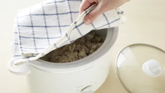 Step4Pour sausage mixture on top of biscuit pieces in slow cooker. Cover top of insert with large kitchen towel. Place slow-cooker lid on top of towel. (This will prevent condensation from dripping onto biscuits during cooking.)