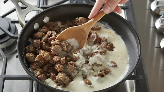 Step2Decrease heat to medium. Add butter to drippings in skillet; cook until butter is melted. Add flour and pepper; cook about 1 minute, stirring constantly with whisk, until no lumps remain. Slowly add milk; cook 1 to 3 minutes, stirring constantly, until mixture is thickened. Stir in cooked sausage.
