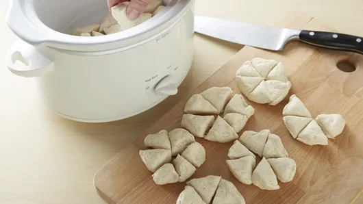 Step3Spray 5- to 6-quart oval slow cooker with cooking spray. Separate dough into 8 biscuits. Cut each biscuit into 6 pieces; place in slow cooker.
