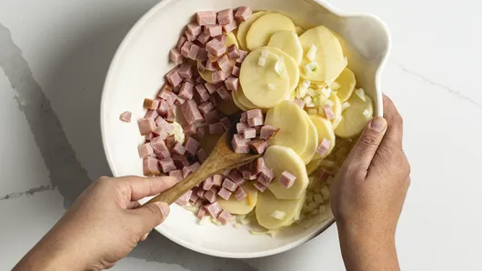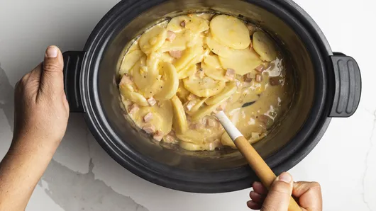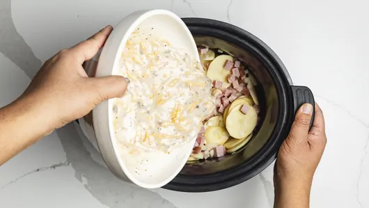 var configuration = {"title":"Slow-Cooker Cheesy Potatoes and Ham","introduction":"\u003cp\u003eA slow-cooker side is a lifesaver for busy nights, dinner parties, and holidays when the oven and stove are overcrowded. Delegate a dish or two to your auxiliary kitchen appliances for a stress-free cooking experience.\u003c/p\u003e\u003cp\u003eThis easy Slow-Cooker Cheesy Potatoes and Ham recipe is simple, filling, and always crowd-pleasing. With just a few easy steps, you can have a great dish that works as a side or brunch staple. You can customize some of the ingredients to your taste, and this recipe will quickly become a family favorite!\u0026nbsp;\u003c/p\u003e","servingSize":"1 Serving","image":{"small":{"media":"(min-width: 0px)","src":"https://mojo.generalmills.com/api/public/content/Xi9GPUDcQLutqXbGHoWZwg_webp_base.webp?v=1599a69e\u0026t=e724eca7b3c24a8aaa6e089ed9e611fd"},"medium":{"media":"(min-width: 500px)","src":"https://mojo.generalmills.com/api/public/content/Xi9GPUDcQLutqXbGHoWZwg_webp_base.webp?v=1599a69e\u0026t=191ddcab8d1c415fa10fa00a14351227"},"large":{"media":"(min-width: 767px)","src":"https://mojo.generalmills.com/api/public/content/Xi9GPUDcQLutqXbGHoWZwg_webp_base.webp?v=1599a69e\u0026t=191ddcab8d1c415fa10fa00a14351227"},"alt":"Slow-Cooker Cheesy Potatoes and Ham"},"contributor":{"label":"By","name":"Edited by Joanna","profileUrl":"/about-us/joanna","displayDate":{"label":"Updated","date":"Dec 17, 2025"}},"ingredientGroups":[{"ingredients":[{"quantity":"6","description":"medium potatoes, peeled and cut into 1/4-inch-thick slices (about 6 cups)"},{"quantity":"1","description":"medium onion, coarsely chopped (1 cup)"},{"quantity":"1 1/2","description":"cups cubed cooked ham"},{"quantity":"1","description":"can (10 3/4 oz) condensed cream of mushroom soup"},{"quantity":"1/2","description":"cup milk"},{"quantity":"1 1/2","description":"cups shredded cheddar cheese (6 oz)"},{"quantity":"1/4","description":"teaspoon pepper"}]}],"steps":[{"description":"\u003cp\u003eSpray 3- to 4-quart slow cooker with cooking spray. In large bowl, mix potatoes, onion, and ham; spoon into slow cooker.\u003c/p\u003e","stepShotImageUrl":"//mojo.generalmills.com/api/public/content/JMPP92-sT5SXwEX2oL1sDQ_webp_base.webp?v=2244ab67\u0026t=51a43a57af4046789e5a7f20567b1195"},{"description":"\u003cp\u003eIn medium bowl, mix soup, milk, cheese, and pepper; pour over potato mixture.\u003c/p\u003e","stepShotImageUrl":"//mojo.generalmills.com/api/public/content/_xkW0hKfRf-MZUViCj1c7Q_webp_base.webp?v=f0574ecd\u0026t=51a43a57af4046789e5a7f20567b1195"},{"description":"Cover; cook on High heat setting 3 to 4 hours or until potatoes are tender. Gently stir potatoes before serving.","stepShotImageUrl":"//mojo.generalmills.com/api/public/content/NLIQooMCQXOt8FKHzjeEaw_webp_base.webp?v=75e63292\u0026t=51a43a57af4046789e5a7f20567b1195"}],"tips":[{"title":"","description":"Slow-Cooker Cheesy Potatoes and Ham is a flavorful side dish that you can use for dinner, brunch, or anywhere in between!\u0026nbsp;","category":"Rich Snippet","tipShots":[]},{"title":"","description":"\u003cp\u003eYou can make these slow-cooked potatoes with russet, Yukon Gold, or red potatoes.\u003c/p\u003e","category":"Variation","tipShots":[]},{"title":"","description":"\u003cp\u003eEach slow cooker varies in performance. Check the potatoes for doneness at the minimum time to prevent overcooking.\u003c/p\u003e","category":"Recipe/Ingredient Facts","tipShots":[]},{"title":"","description":"Kitchen Tested - 4/2015.","category":"Kitchen Tested","tipShots":[]}],"kitchenTips":[{"title":"","description":"\u003cp\u003eYou can make these slow-cooked potatoes with russet, Yukon Gold, or red potatoes.\u003c/p\u003e","category":"Variation","tipShots":[]},{"title":"","description":"\u003cp\u003eEach slow cooker varies in performance. Check the potatoes for doneness at the minimum time to prevent overcooking.\u003c/p\u003e","category":"Recipe/Ingredient Facts","tipShots":[]}],"additionalContent":[{"title":"Recipe Ingredients ","description":"\u003cp\u003eThe ingredients for this recipe are simple and accessible at most grocery stores.\u003c/p\u003e\u003cp\u003e\u003cstrong\u003ePotatoes: \u003c/strong\u003eWe use about 6 medium potatoes for this recipe—when sliced, this ends up being around 6 cups of potatoes. We suggest thinly slicing them, but you can dice instead if you prefer. No matter the shape or size of potato, you’ll know they’re ready when they’re fork-tender.\u003c/p\u003e\u003cp\u003e\u003cstrong\u003eCubed Cooked Ham: \u003c/strong\u003eYou can get pre-cubed ham at many grocery stores, or use leftover ham if you have it. The ham adds saltiness and savory flavor.\u003c/p\u003e\u003cp\u003e\u003cstrong\u003eCream of Mushroom Soup:\u003c/strong\u003e This soup adds creaminess and flavor to the potatoes. You can substitute cream of chicken or cream of broccoli soup if you prefer.\u003c/p\u003e\u003cp\u003e\u003cstrong\u003eOther Ingredients You’ll Need:\u003c/strong\u003e A coarsely chopped onion adds flavor and goes fantastically with potatoes. Milk thins out the cream of mushroom soup, which is often condensed in a can. Shredded cheddar cheese adds additional cheesiness and creaminess. Pepper is a finishing spice that helps to heighten the flavors in the dish.\u003c/p\u003e","category":"SEO Content_1","tipShots":[{"name":"ExtraTextTypeImageMediumUrl","sortOrder":1,"url":"//mojo.generalmills.com/api/public/content/X2jhUaa6R5mUkv8lPJ-0Ww_webp_base.webp?v=27de6ca2\u0026t=51a43a57af4046789e5a7f20567b1195"}]},{"title":"How to Make Slow-Cooker Cheesy Potatoes and Ham","description":"\u003cp\u003eThis recipe is not only delicious, it’s extremely easy to make. Your slow cooker makes it a hands-off cooking process, so it’s the perfect dish for busy nights or holidays when the kitchen is packed. See the full instructions below when you’re ready to cook.\u003c/p\u003e\u003ch3\u003e\u003cstrong\u003e1. Mix Ingredients\u003c/strong\u003e\u