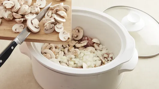 Step1Spray 3 1/2- to 4-quart slow cooker with cooking spray. Add chicken, mushrooms, onion, Italian seasoning and salt to slow cooker.