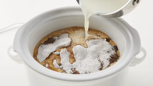 Step2In 2-quart saucepan, heat remaining 2 cups milk over medium heat 3 to 5 minutes, stirring frequently, until hot and bubbly. Remove from heat. Sprinkle butterscotch pudding mix over batter in slow cooker. Slowly pour hot milk over pudding.