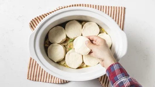 Top the filling with a layer of Pillsbury biscuits; then, put the slow-cooker insert into a 350°F oven and bake until the biscuits are cooked through. They’ll be golden brown on top but soft and tender where they’re touching the creamy filling, almost like dumplings. If you prefer the biscuits extra crisp, you can bake them separately according to the package instructions, and add them at the end.