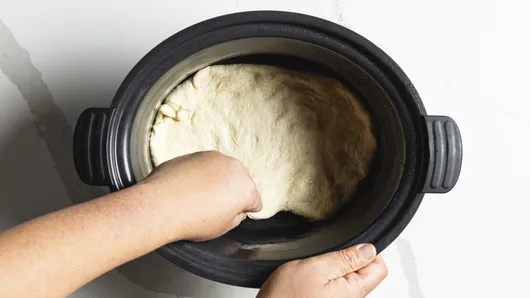 Spray a 3½- to 4-quart oval slow cooker with cooking spray to prevent the pizza from sticking. Unroll the pizza dough, and fold it in half crosswise. Then, press it into the bottom of the slow cooker and about 1 inch up the sides.