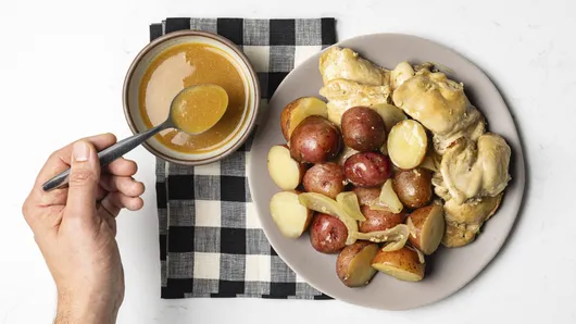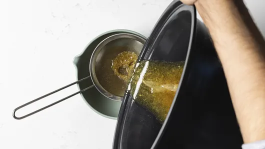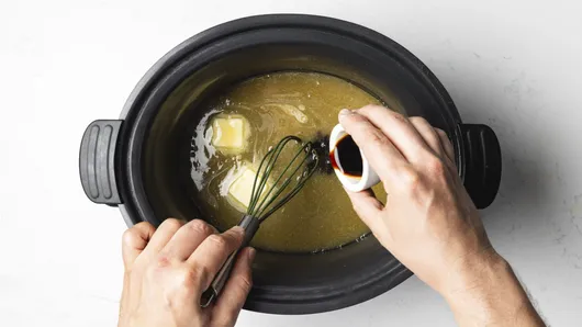 With small strainer, strain cooking juices into medium bowl; transfer cooking juices back to slow cooker.